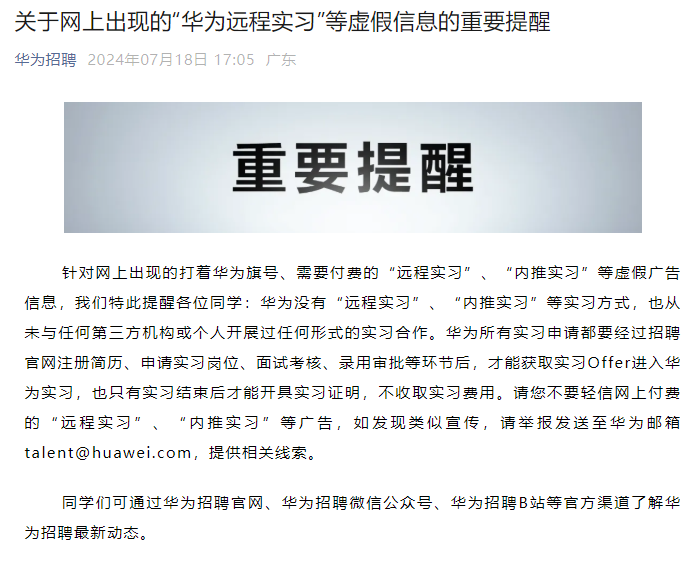 7月18日,针对网上出现的打着华为旗号、需要付费的“远程实习”、“内推实习”等虚假广告信息,华为也发文提醒,“华为没有‘远程实习’、‘内推实习’等实习方式,也从未与任何第三方机构或个人开展过任何形式的实习合作。”