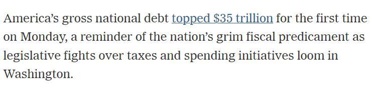 《纽约时报》:美债总额首次突破35万亿美元的事实提醒人们,围绕税收和支出计划的立法斗争在华盛顿再次迫近了。
