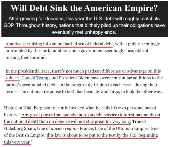 文章援引英国历史学家尼尔·弗格森的话说,任何一个还债支出超过其军费开支的大国都不可能长期保持强大,历史上的欧洲各大帝国莫不如此。