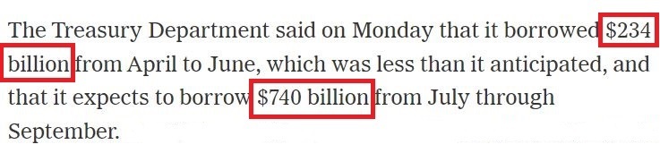 《纽约时报》:美国财政部7月29日称,它在今年第二季度借债2340亿美元,预计第三季度将借债7400亿美元。