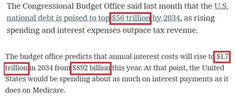 据美国国会预算办公室预测,到十年后的2034年,美债将超过56万亿美元。