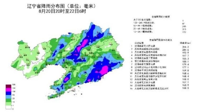 累计降雨量位列前三的是:沈阳市新民大民屯镇266.2毫米、丹东市凤城东汤镇土城村244.6毫米、丹东市宽甸县杨木川镇192.9毫米。