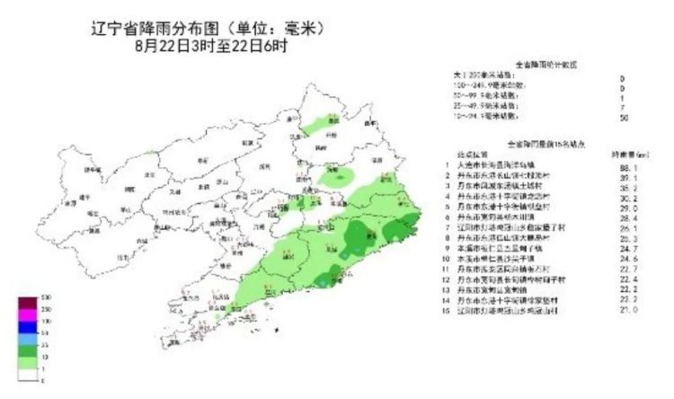 8月22日5时至6时,丹东地区及庄河、岫岩、抚顺市区、本溪市区、桓仁出现小雨,局部中雨,丹东地区的1个乡镇出现大雨。最大降雨量28.3毫米出现在丹东市东港十字街镇龙源村。