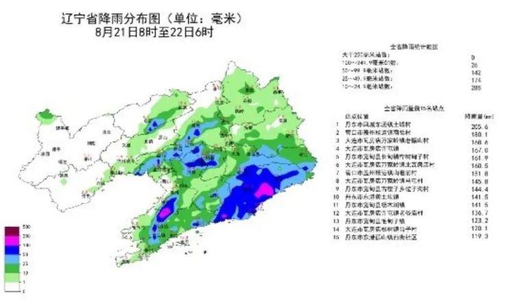 累计降雨量位列前三的是:丹东市凤城东汤镇土城村205.6毫米、营口市盖州杨运镇南岔村180.1毫米、大连市瓦房店万家岭镇老帽山村168.6毫米。