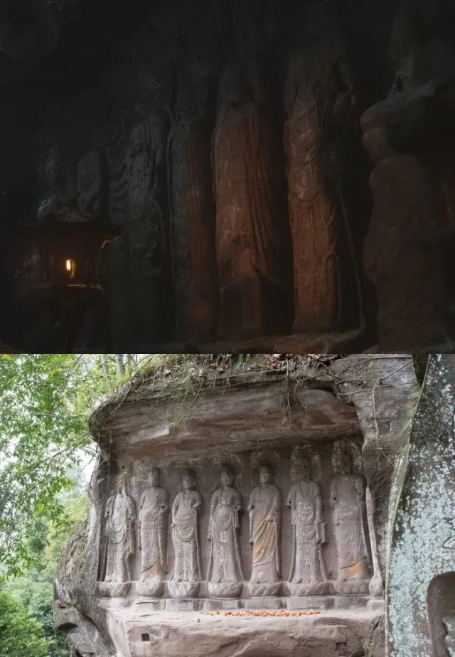 上为游戏场景,下为千佛寨石刻造像,图片源自安岳县石窟研究院。