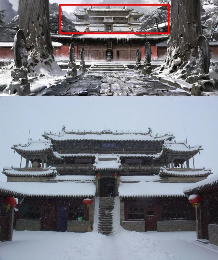 上为游戏场景,下为蔚州玉皇阁。图片源自蔚县文化广电和旅游局。
