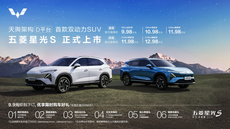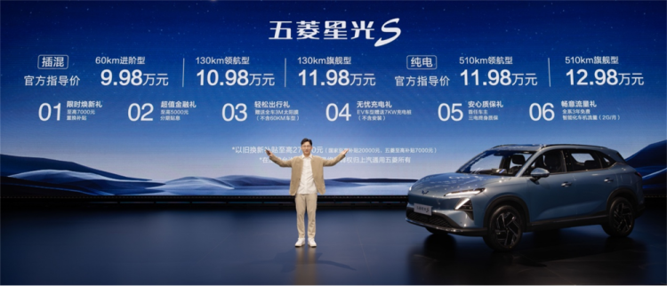 2024年8月28日,五菱汽车旗下家用大空间SUV-五菱星光S正式上市,全系5款配置及售价信息公布。新车提供插混(PHEV)车型和纯电(EV)车型两种动力版本,官方售价9.98万元-12.98万元。