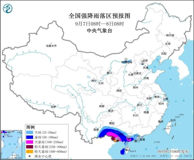 中央气象台7日8时发布的天气公报显示,受台风“摩羯”影响,预计,9月7日08时至8日08时,广西中南部、广东西南部、海南岛西部、云南东南部以及内蒙古中部、河北中部等地部分地区有大到暴雨,其中,广西南部、广东西南部、云南东南部等地部分地区有大暴雨,广西南部沿海局地特大暴雨(250~4!50毫米)。上述部分地区伴有短时强降水(最大小时降雨量50~80毫米,局地可超过100毫米)。