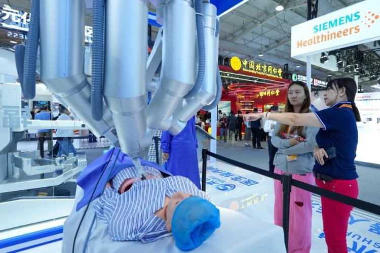 9月12日,在服贸会首钢园区的健康卫生服务专区,参观者在了解展出的一款手术机器人。新华社记者 鞠焕宗 摄