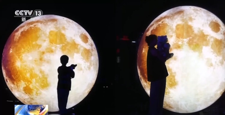总台记者 刘潇凡:中心广场上,我身后是由镜面材料制成的6个大小不同的月亮,我们可以看到它们或满月或新月,形态各异,意境十足。