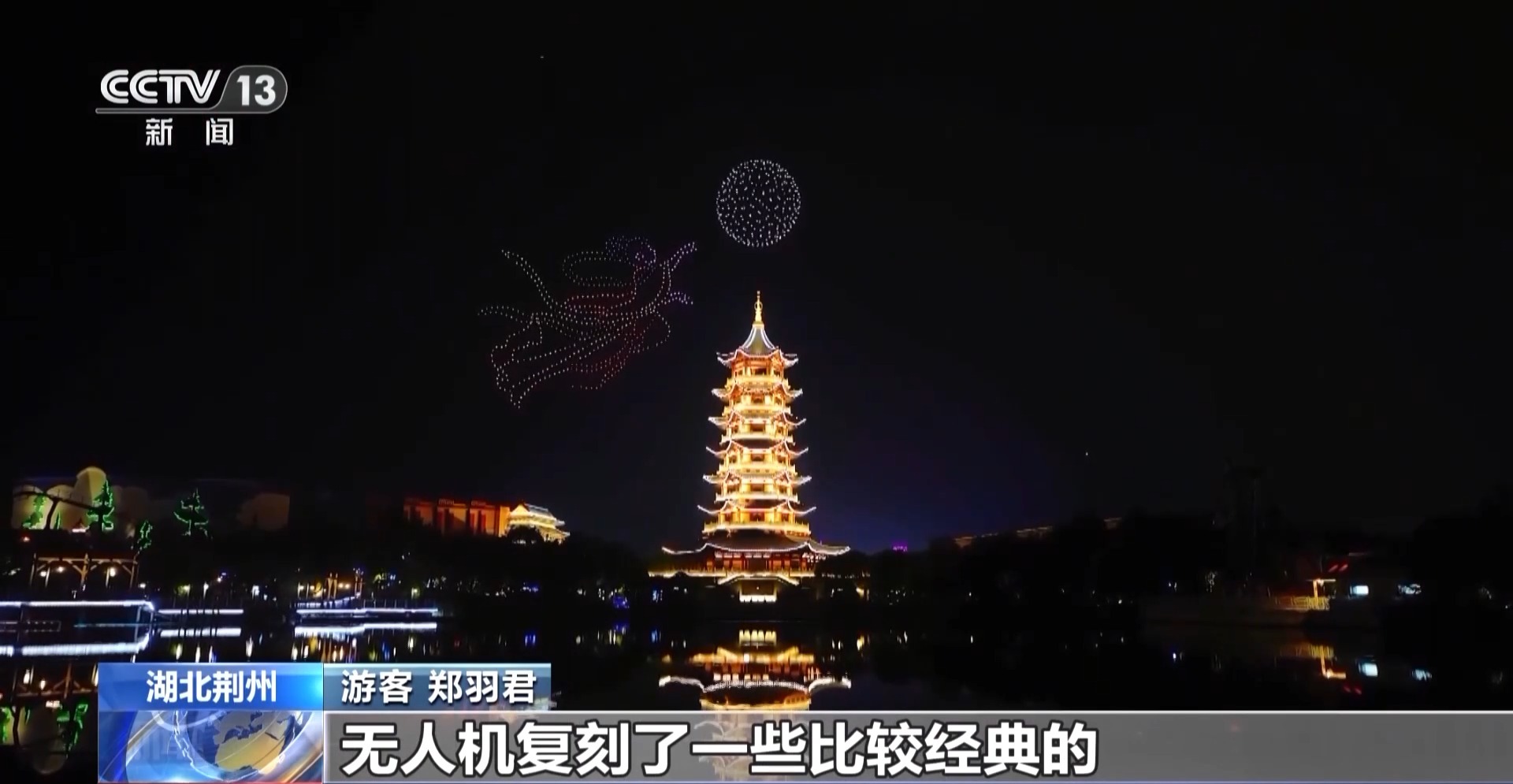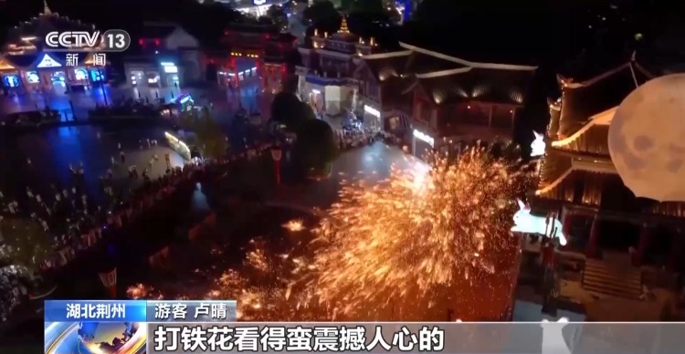 在湖北荆州的景区,国家级非物质文化遗产打铁花、无人机光影秀等节目在中秋节轮番上演,传统民俗、国潮时尚与现代科技相融合,让游客们感受到了中华传统文化的魅力。