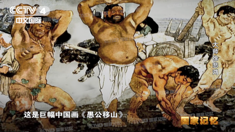 这是巨幅中国画《愚公移山》。徐悲鸿用遒劲的笔触描绘了一群人开山凿石的壮观场面,气势惊人。