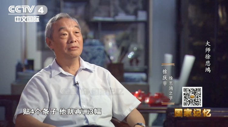 徐悲鸿之子 徐庆平:当时他的画展出的时候,大家贴红条子,贴了红条子就说这张画已经卖了。但是他有好多画,人家都喜欢,贴好几个红条子。那怎么办呢?只要贴了条子,贴4个条子他就再画3幅,贴5个条子他就再画4幅,能尽多大力量就尽多大力量。