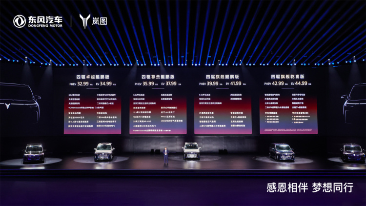 9月19日,以“感恩相伴 梦想同行”为主题的东风汽车感恩6000万用户相伴暨全新岚图梦想家上市发布会于武汉成功举办,全新岚图梦想家正式上市并公布价格,其中,全新岚图梦想家四驱卓越鲲鹏版PHEV 32.99万元、EV 34.99万元;全新岚图梦想家四驱尊贵鲲鹏版PHEV 35.99万元、EV 37.99万元;全新岚图梦想家四驱旗舰鲲鹏版PHEV 39.99万元、EV 41.99万元;全新岚图梦想家四驱旗舰乾崑版PHEV 42.99万元、EV 44.99万元。同时,截至10月10日,岚图还为用户提供至高6.8万元的首销期专享权益,包含2千元抵5千元现金抵扣,原价3万首销期仅需1万元的ADS3.0高阶智驾包;此外还有用车无忧、服务无忧、0息金融等权益;针对换购的用户还有至高3万元的置换补贴。