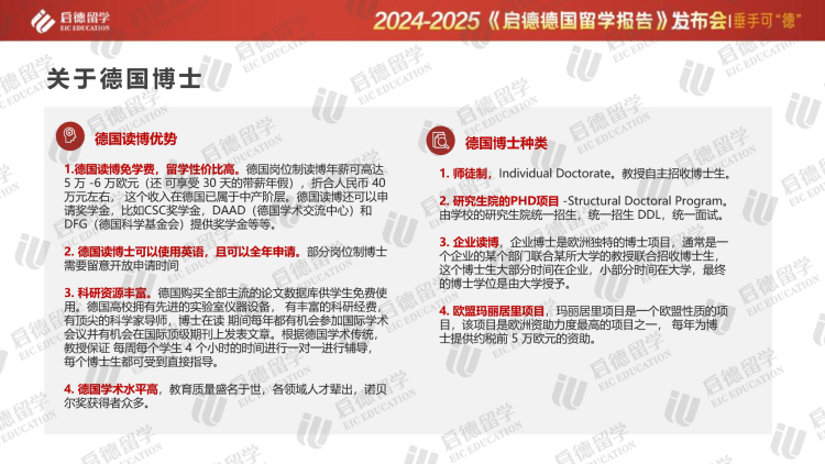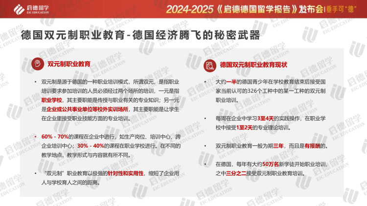 作为欧洲最大的经济体与世界第三大经济体,德国经济实力居欧洲首位,就业机会丰富,因其高质量的教育水平、公立大学大多免收学费等优势,成为中国学生欧洲留学的首选国家之一。为了让更多的家长和学生了解德国教育体制及留学现状,2024年9月21日,启德教育发布《2024-2025德国留学报告》,结合了历年来的启德留学统计数据以及德意志学术交流中心DAAD、留德人员审核部、德国使领馆等诸多官方机构的数据及信息,与德国留学毕业与就业情况,为意向留学德国的学生及家庭提供系统专业的分析与建议。