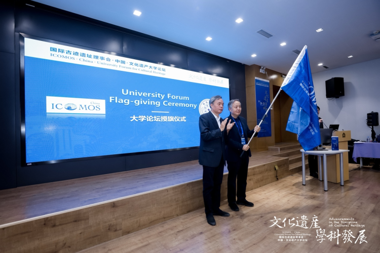 开幕式上,宋新潮理事长将“ICOMOS·中国·文化遗产大学论坛”旗帜授予首届论坛主席张杰教授。