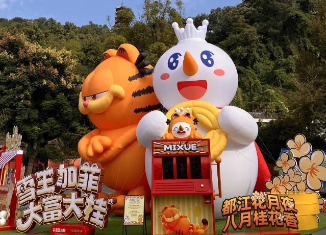 国庆期间,在都江堰景区及周边设大型互动打卡点,蜜雪冰城首发新品“大富大桂”,景区吉祥物“水灵灵”与“雪王”共贺新中国75周年华诞,打卡即送联名礼品。超大气模空降玉垒山公园,游客在蜜雪冰城店内任意消费两杯桂花系列新品,凭消费小票即可体验拉霸机掉落扭蛋,超多礼品宠客都江堰。同时,星巴克“星动车站”入驻,打造都江堰特色饮品,凭景区门票享升杯福利,快闪活动邀您“嚯咖啡,逛都江堰”!