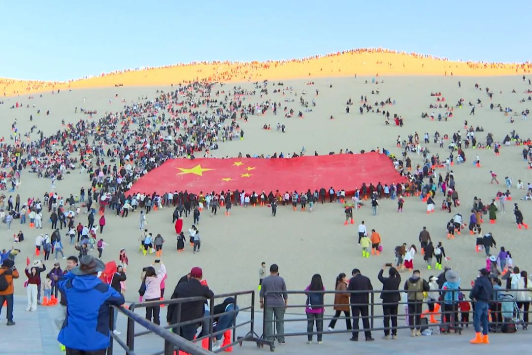 大漠日落时分,众多游客齐心协力托举着一面面积约600平方米的巨大国旗,缓缓爬上甘肃敦煌鸣沙山,拉开了万人星空演唱会国庆专场的序幕。