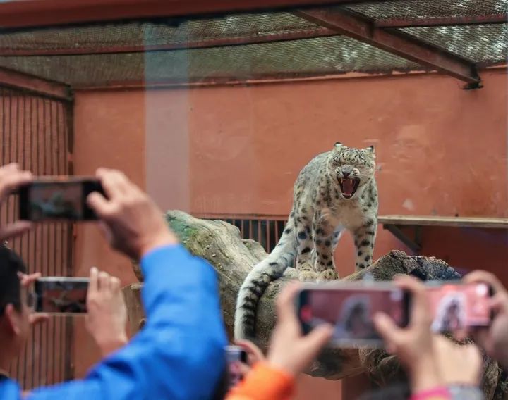 前来观赏的游客人头攒动,观赏几只“大猫”的一举一动,争相为它们拍照留念,在社交媒体上发布展示雪豹的英姿。