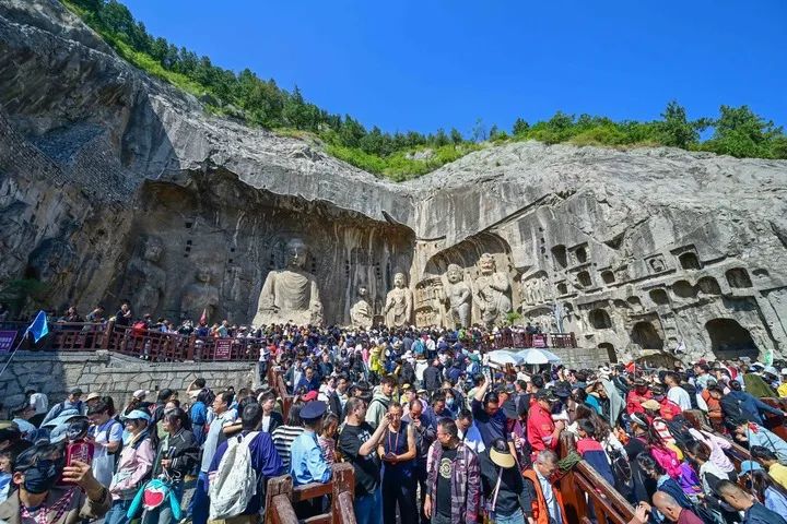 10月2日,游客在河南省洛阳市龙门石窟景区内游览。新华社发(李卫超摄)