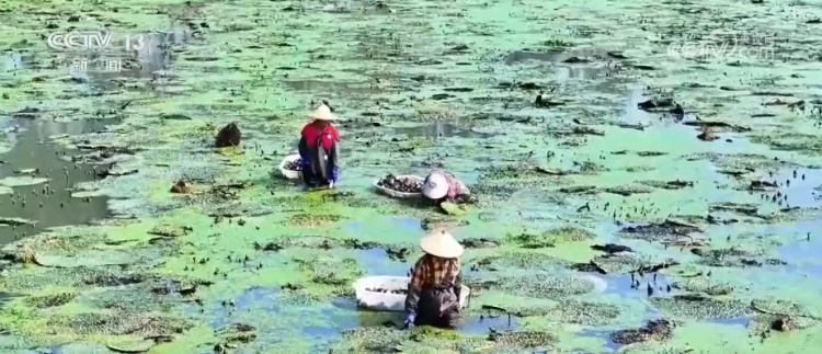 一大早,采摘工人们就来到芡实基地,穿梭在被芡实叶片铺满的水塘中,用手中的刀划开芡实叶,熟练地割下一个个鲜嫩饱满的芡实果。随着国庆假期的消费持续升温,这几天当地采摘工人每天的工作量大都在10个小时左右。