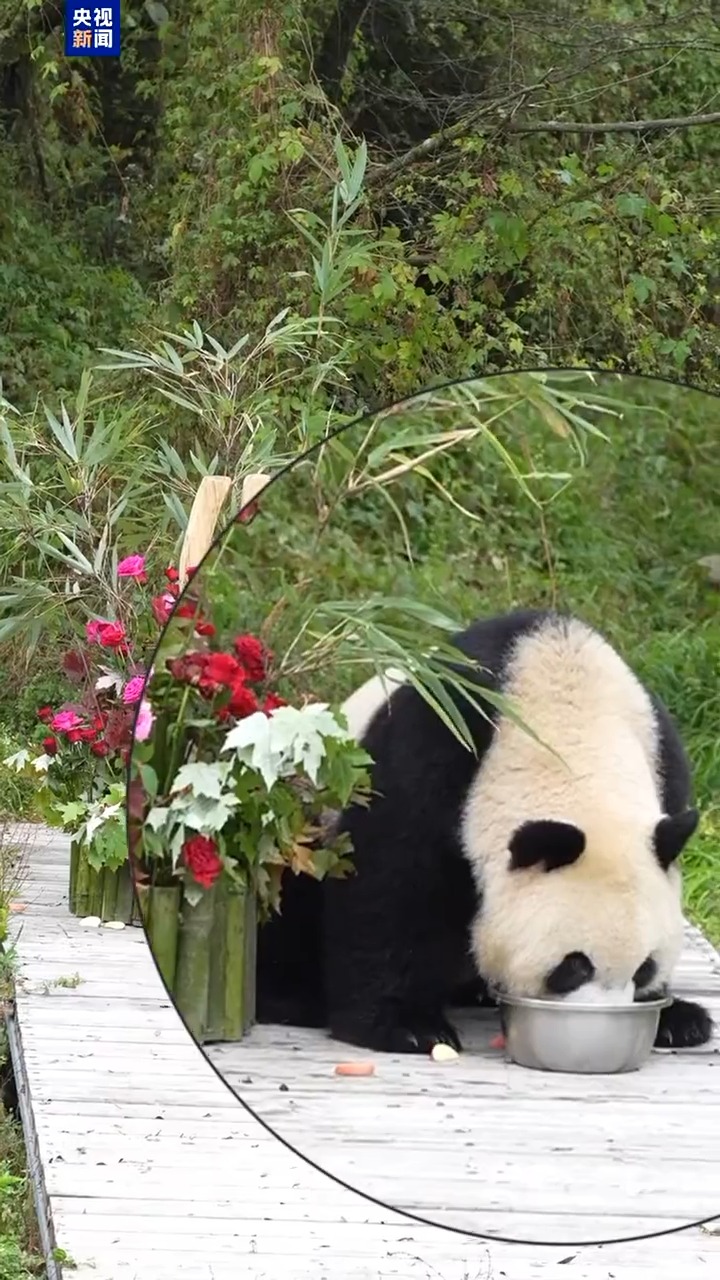 10月11日,在陕西汉中洋县华阳景区,秦岭大熊猫“秦华”迎来4岁生日。保育员专门为它准备了一个用竹子、竹筒、月季花和红枫叶做成的特殊“生日蛋糕”,并为“秦华”准备了苹果、胡萝卜和它最爱的盆盆奶。