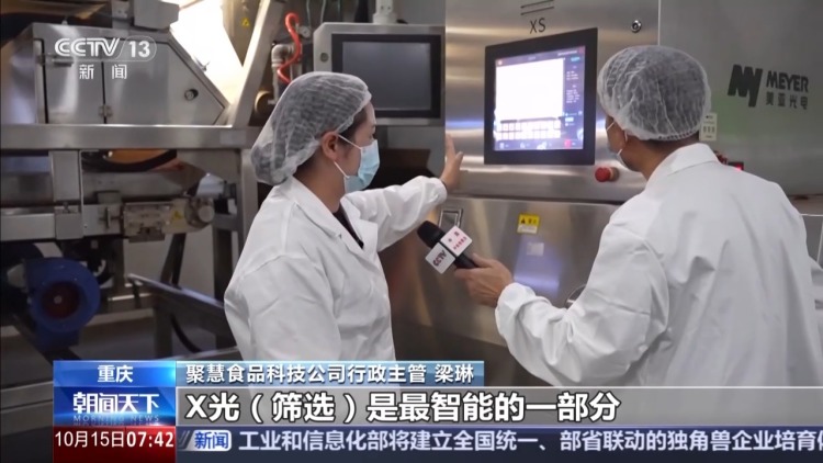 重庆聚慧食品科技公司行政主管 梁琳:X光筛选是最智能的一部分,可以达到99%的挑选率,后面再通过两道人工筛选,保证辣椒100%去除异质,送到生产线。