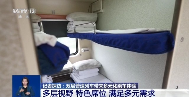 总台央视记者 陈晰:在软卧车厢的上层,还有其他列车上难得一见的“双人”标间,两张床铺独享一扇大窗户,在窗外美景尽收眼底的同时,也有相对静谧的空间。