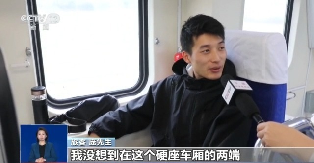旅客 庞先生:我没想到在这个硬座车厢的两端还有单人单座,我也是第一次坐。座位前面有一个小桌板,可以放平板之类的东西。