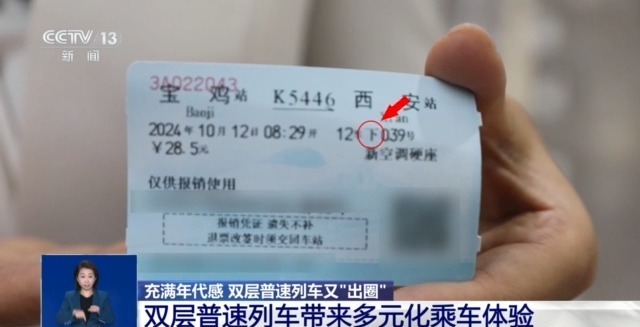 总台央视记者 陈晰:在这趟车的车票上有一个“下”字,单层列车没有这样的字,“上”和“下”是为了区分上下层,“下”字就表示我买的座位是在下层。