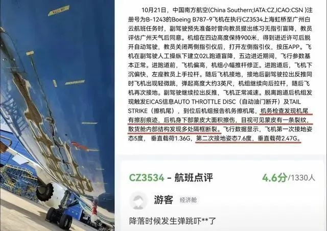 10月23日,有多名网友反映,“机务检查发现机尾有擦刮痕迹,后机身下部蒙皮大面积擦伤,目视可见蒙皮有一条裂纹,散货舱内部结构发现多处隔框断裂。”