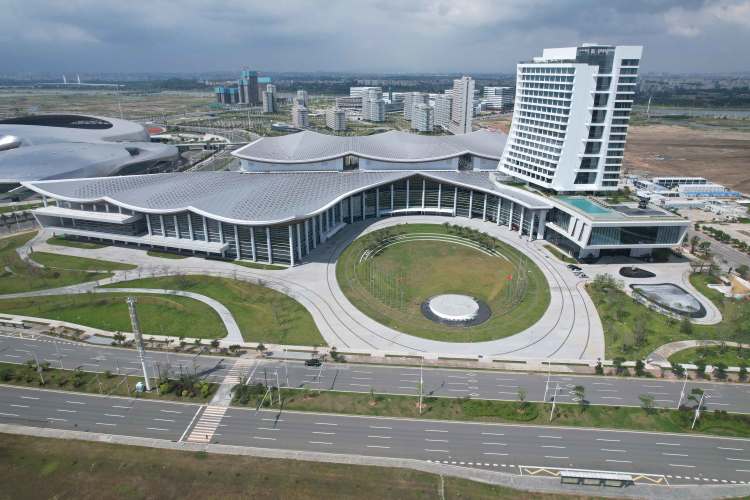从外观上,会展中心以“潮起逐浪、扬帆起航”为主题,整座建筑如舟、屋顶景观似潮,中交四航局建设团队成功把设计蓝图化成实物,完美彰显出潮汕传统文化、港湾文化和“侨”文化特色,以现代方式对潮汕文化元素进行演绎和表达,彰显潮汕韵味和特区魅力。