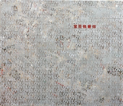 艾敬向记者回忆说,2008年的5月20日,她飞往香港,抵达后,才得知这一灾难。她收集了香港和北京报道汶川地震的报纸,将头版图片贴在画布上。艾敬用黑白和生赭色丙烯颜料,调配出类似水泥的色彩,覆盖在这些图片上,再用砂纸打磨画面,“创作出了一个类似航拍断壁残垣的视觉效果,虽然这样的画面很有冲击力,但我觉得太过直接。艺术需要独特的手法和创作逻辑。”经过深思熟虑,她决定用“LOVE”字样覆盖在画面上,这些凸起的字母如同墙壁上的涂料,坚硬而脆弱,仿佛要封存那些痛苦。最后,她用油画材料和深红色绘制了“宝贝我爱你”,这行字凝重而热烈,如同血液般浓稠。