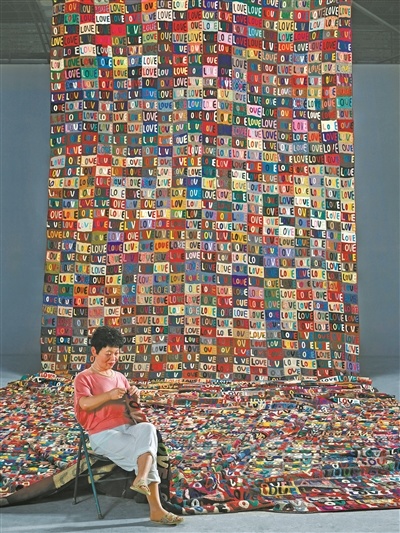 艾敬还有一幅代表作品是《我的母亲和我的家乡》,是一位慈祥的妇人坐在椅子上织着毛毯,脸上洋溢着幸福的微笑,从她身后延伸出去的是一张高6米宽16米长的挂毯,由五颜六色的“love”拼接而成。这是以艾敬的母亲为蓝本塑造的。