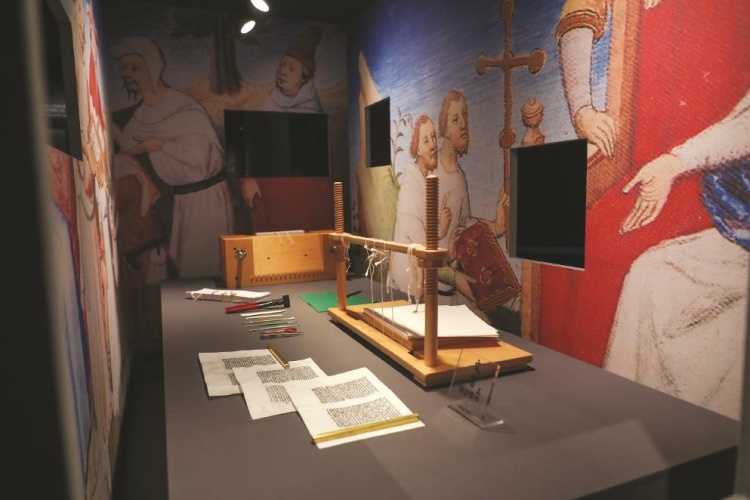 展览现场搭建了一个欧洲传统造书工坊的展示区,陈列手工造书用到的主要工具。 本报记者 叶辰亮 摄
