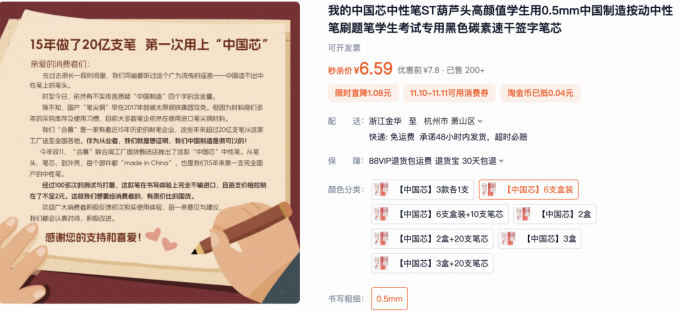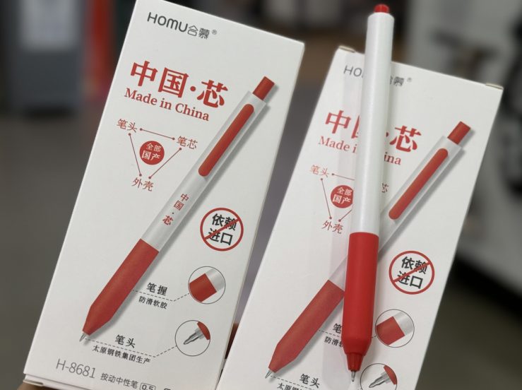 近日,记者注意到,一款名为“中国芯”的定制中性笔在淘工厂国货甄选店上线了。商品介绍图上,醒目印着“笔头笔芯外壳全部国产”、“不依赖进口”、“太原钢铁集团生产笔头”等字样。而且,6支装一盒,每支售价不足2元。