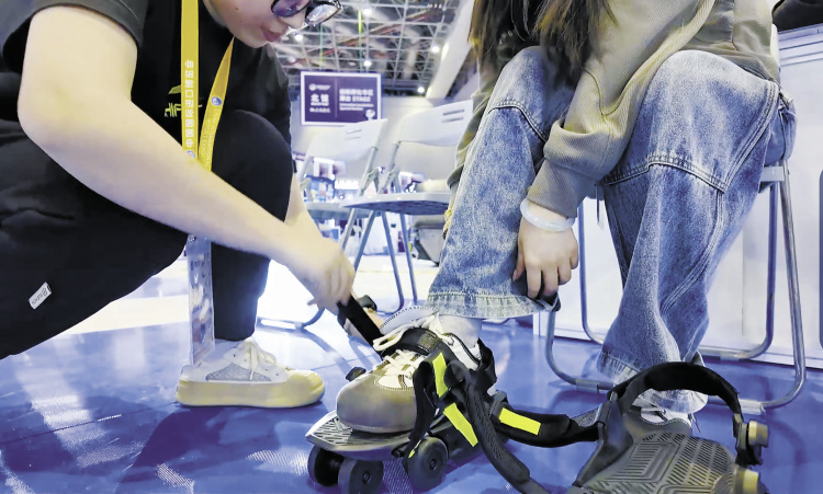 首度参展的美国瞬动科技公司带来了世界上首款能让人以跑步速度行走的智能动力鞋——踏月者。这款智能动力鞋外观看上去就像一双带轮子的系带凉鞋,一只却足有1.9千克。但记者现场体验发现,智能动力鞋穿在脚上走起来不仅省力,而且在滑行轮的助力下“行走如飞”。