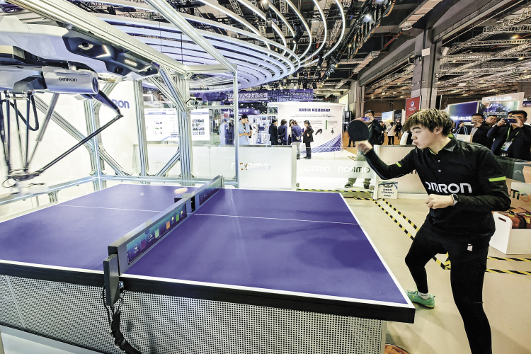 吸引眼球的还有技术装备展区的欧姆龙,该公司的“FORPHEUS”乒乓球教练机器人今年再度亮相进博会,还邀请乒乓球世界冠军牛剑锋与机器人交锋。据介绍,通过传感器,机器人可精准捕捉乒乓球和玩家在对打时丰富的信息,并实时显示玩家的心率,面部表情、眨眼次数等,并通过连续对打来测定能力,选择合适的水平回球。