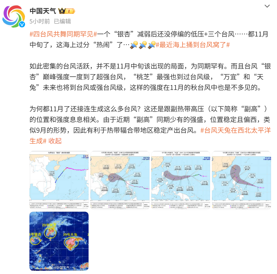 如此密集的台风活跃,并不是11月中旬该出现的局面,为同期罕有。而且台风“银杏”巅峰强度一度到了超强台风,“桃芝”最强也到过台风级,“万宜”和“天兔”未来也将到台风或强台风级,这样的强度在11月的秋台风中也是不多见的。