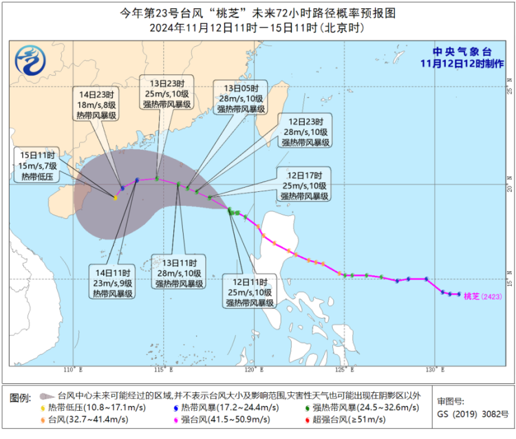 南海北部和中部海面,12日~14日,风力8~10级,其中“桃芝”中心经过的附近海面旋转风11~12级;中沙和西沙群岛附近海面,阵风8~9级。
