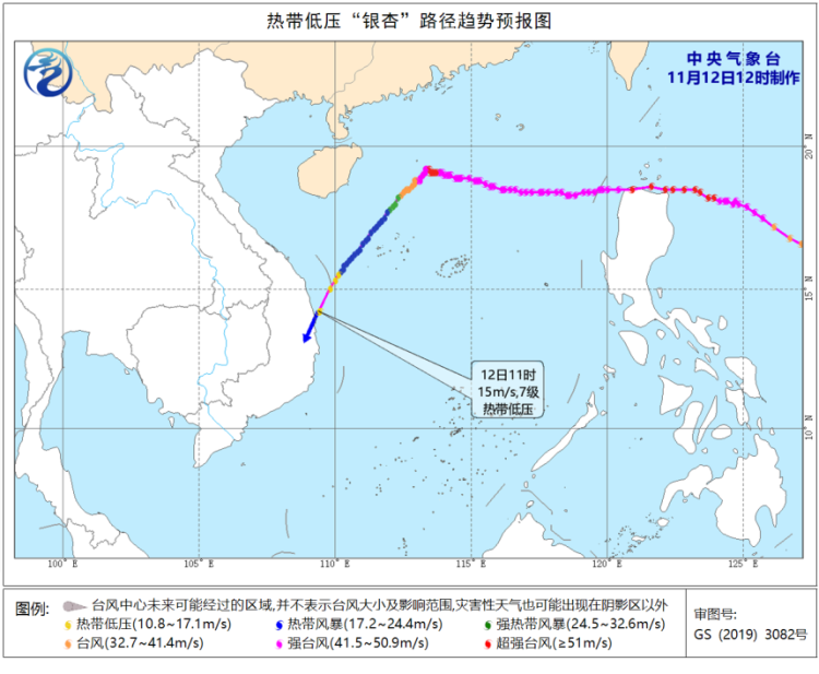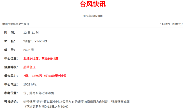 今年第22号台风“银杏”11日夜间由热带风暴级减弱为热带低压,今日(12日)上午11时其中心位于北纬14.2度、东经109.4度,也就是越南东部近海海面,中心附近最大风力7级(15米/秒)。
