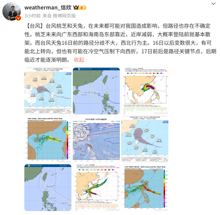 中国气象频道气象分析师信欣介绍:台风桃芝和天兔,在未来都可能对我国造成影响,但路径也存在不确定性。 桃芝未来向广东西部和海南岛东部靠近,近岸减弱,大概率登陆前就基本散架。而台风天兔16日前的路径分歧不大,西北行为主。16日以后变数很大,有可能北上转向,但也有可能在冷空气压制下向西折。17日前后是路径关键节点,后期临近才能逐渐明朗。