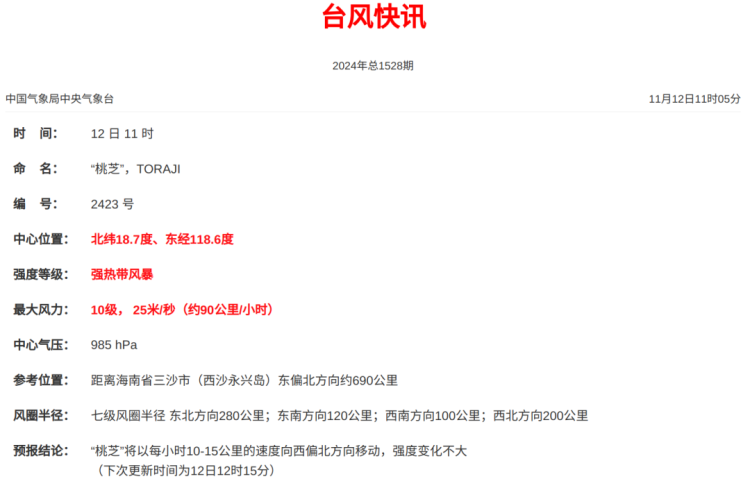 今年第23号台风“桃芝”已于11日上午在菲律宾奥罗拉省东部沿海登陆,登陆时为台风级,11日夜间由台风级减弱为强热带风暴级并移入南海东部海面 ,今日(12日)上午11时其中心位于北纬18.7度、东经118.6度,也就是海南省三沙市(西沙永兴岛)东偏北方向约690公里,中心附近最大风力10级(25米/秒)。