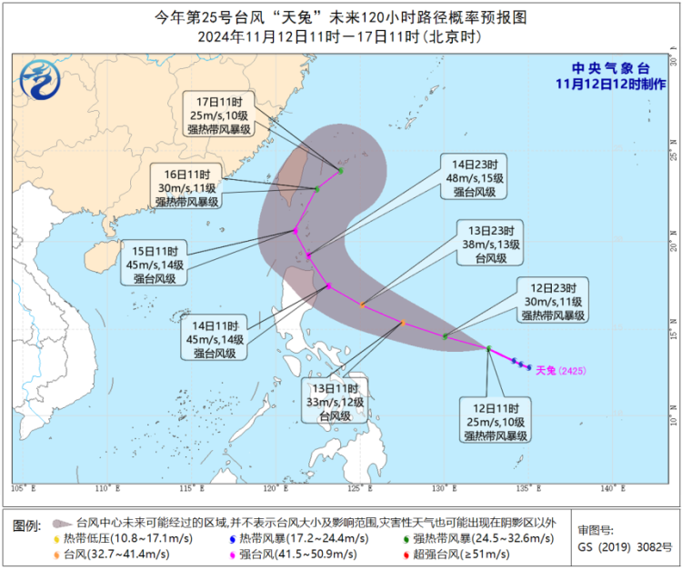 今年第25号台风“天兔”(热带风暴级,英文名称:Usagi;名字来源:日本;名字意义:天兔星座)已于今天(12日)凌晨在西北太平洋洋面上生成,今日(12日)上午11时其中心位于菲律宾马尼拉偏东方向约1250公里的洋面上,就是北纬13.9度、东经132.6度,中心附近最大风力有10级(25米/秒)。