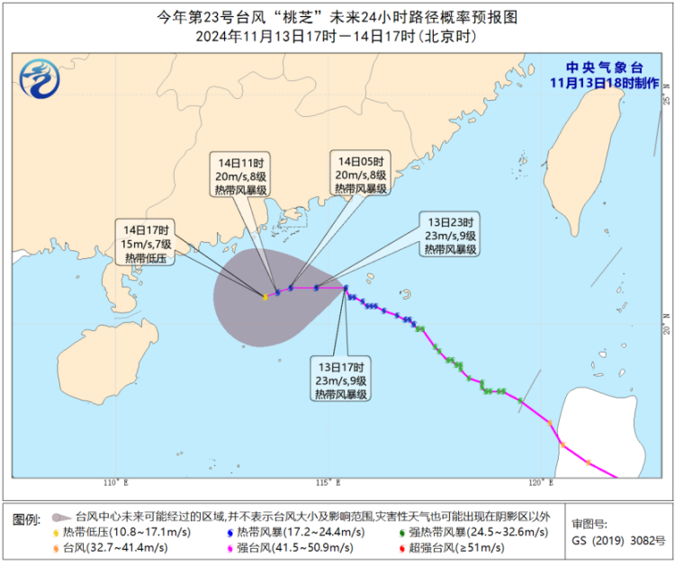 今年第23号台风“桃芝”(热带风暴级)的中心今天(13日)下午5点钟位于海南省三沙市西沙永兴岛东北方向约550公里的南海北部海面上,中心附近最大风力有9级(23米/秒),中心最低气压为990百帕,七级风圈半径100-250公里。预计,“桃芝”将以每小时10公里左右的速度向偏西方向移动,强度逐渐减弱(见图1)。中央气象台11月13日18时继续发布台风蓝色预警。