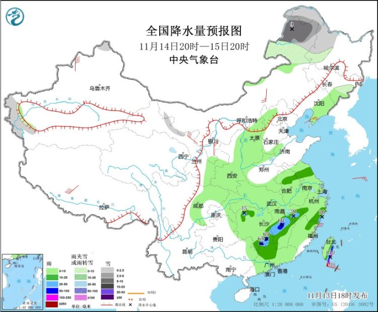 图3 全国降水量预报图(11月13日20时-14日20时)