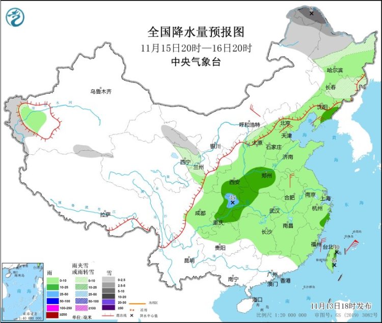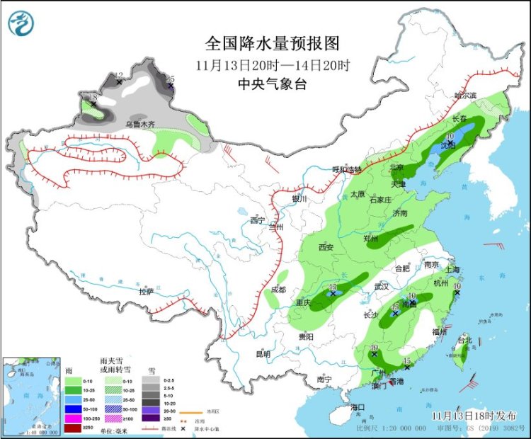 11月13日20时至14日20时,新疆北部和西部等地部分地区有小到中雪或雨夹雪,其中,新疆阿勒泰、塔城和伊犁河谷等地部分地区有大到暴雪,局地大暴雪(20~25毫米)。西北地区东部、西南地区东部、东北地区中南部、华北、黄淮、江汉、江南中东部、华南东部、台湾岛等地部分地区有小到中雨,其中,吉林南部、辽宁中部、湖北西南部、江西中北部、浙江西部和东南部、广东中部和东南部沿海等地部分地区有大雨(25~45毫米)。内蒙古西北部、福建东南部等地部分地区有4~6级风,南海北部海域、巴士海峡将有7~9级、阵风10~11级的大风(见图3)。
