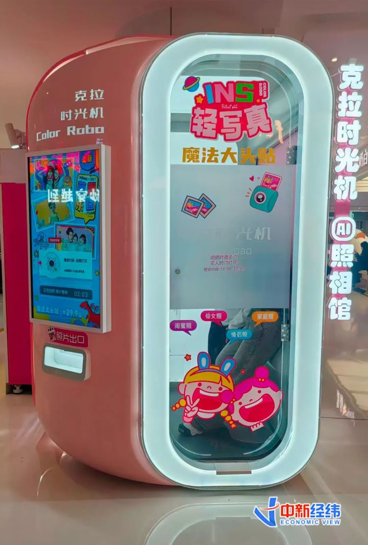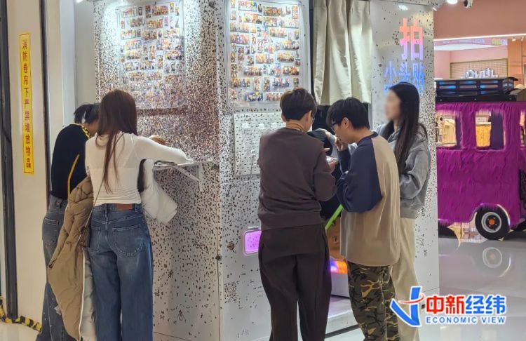 中新经纬近日走访看到,仅北京合生汇商场内便至少投放有十余台大头贴机器,位置多位于人来人往的扶梯附近,与盲盒等潮玩贩卖机“排排坐”。大头贴机器装置较为简单,门帘一拉,便成了与外部隔绝的独立空间,消费者在里面可以尽情“造作”。
