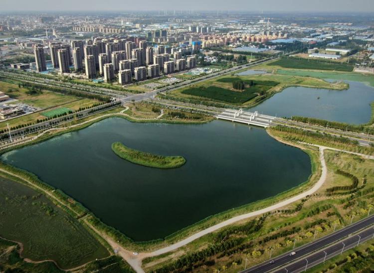 这是2021年6月23日拍摄的河南省开封市兰考县凤鸣湖湿地公园(无人机照片)。新华社记者 李安 摄