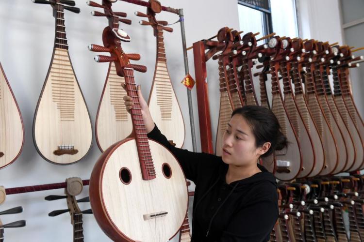 河南省开封市兰考县堌阳镇徐场村村民孔释漫在家庭乐器生产作坊工作(2024年4月17日摄)。新华社记者 朱祥 摄